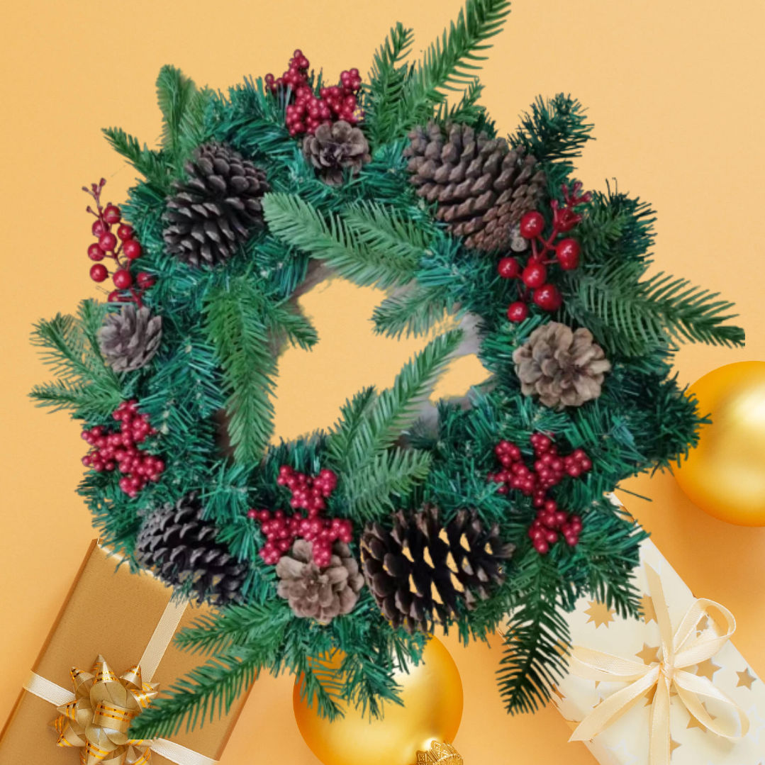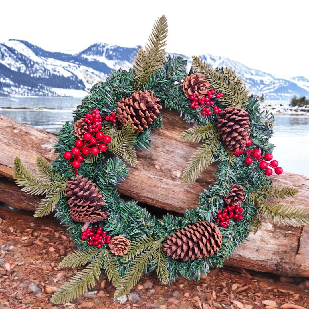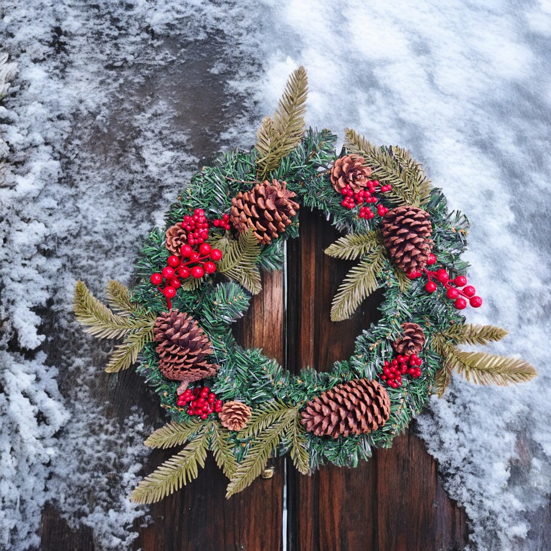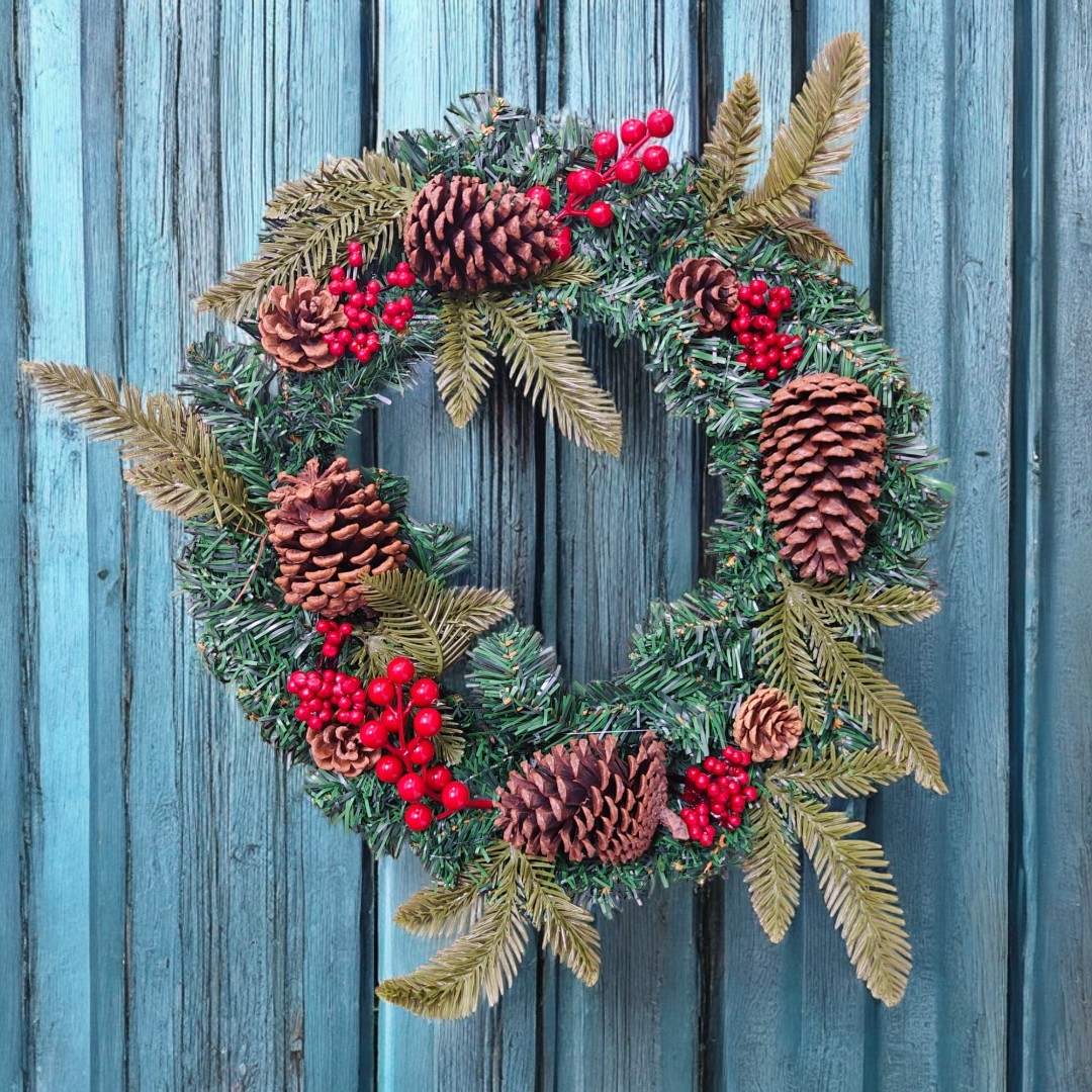 Această ghirlandă de Crăciun prezintă un amestec festiv de ace de pin verzi, ramuri de molid, ramuri de chiparos, crenguțe mari de boabe roșii, ciorchini mici de boabe roșii și conuri de pin naturale, pline de culori de sărbători și farmec de Crăciun!