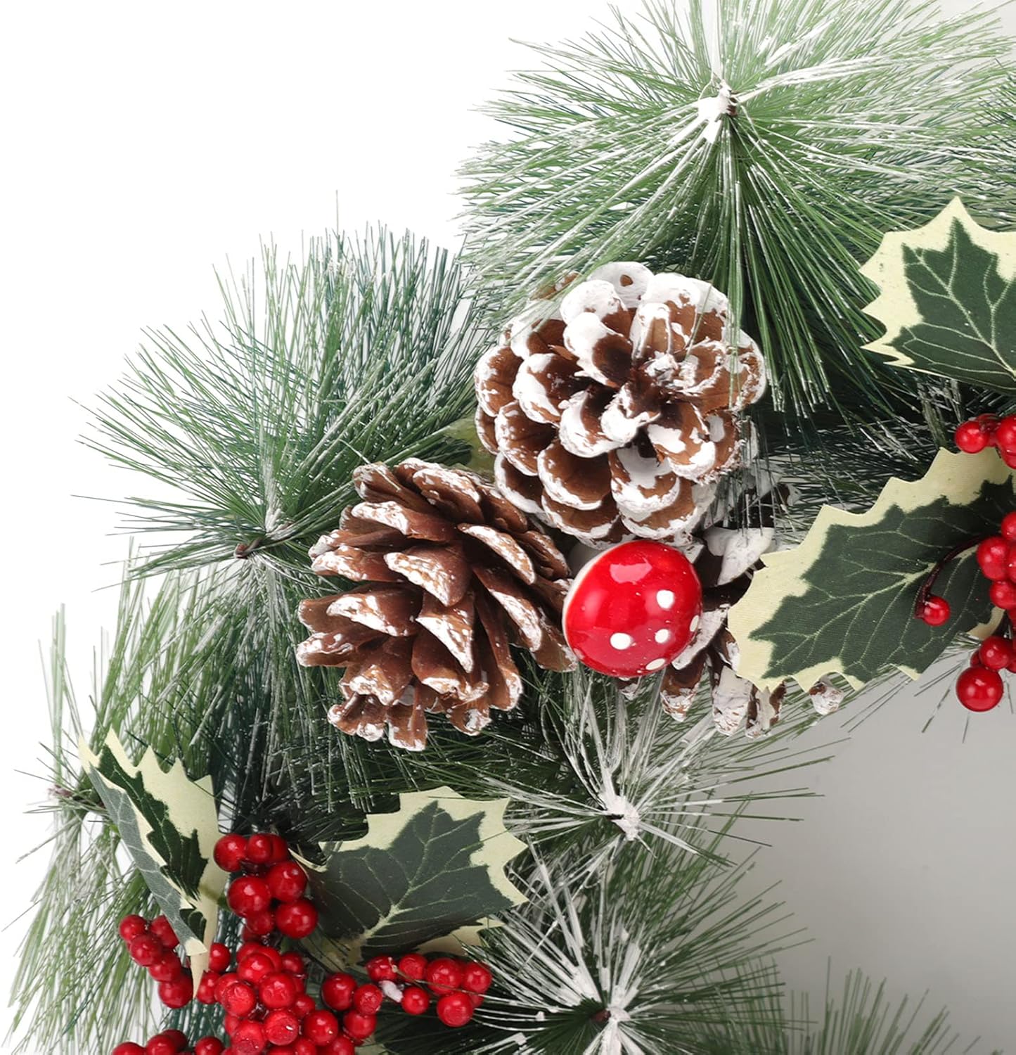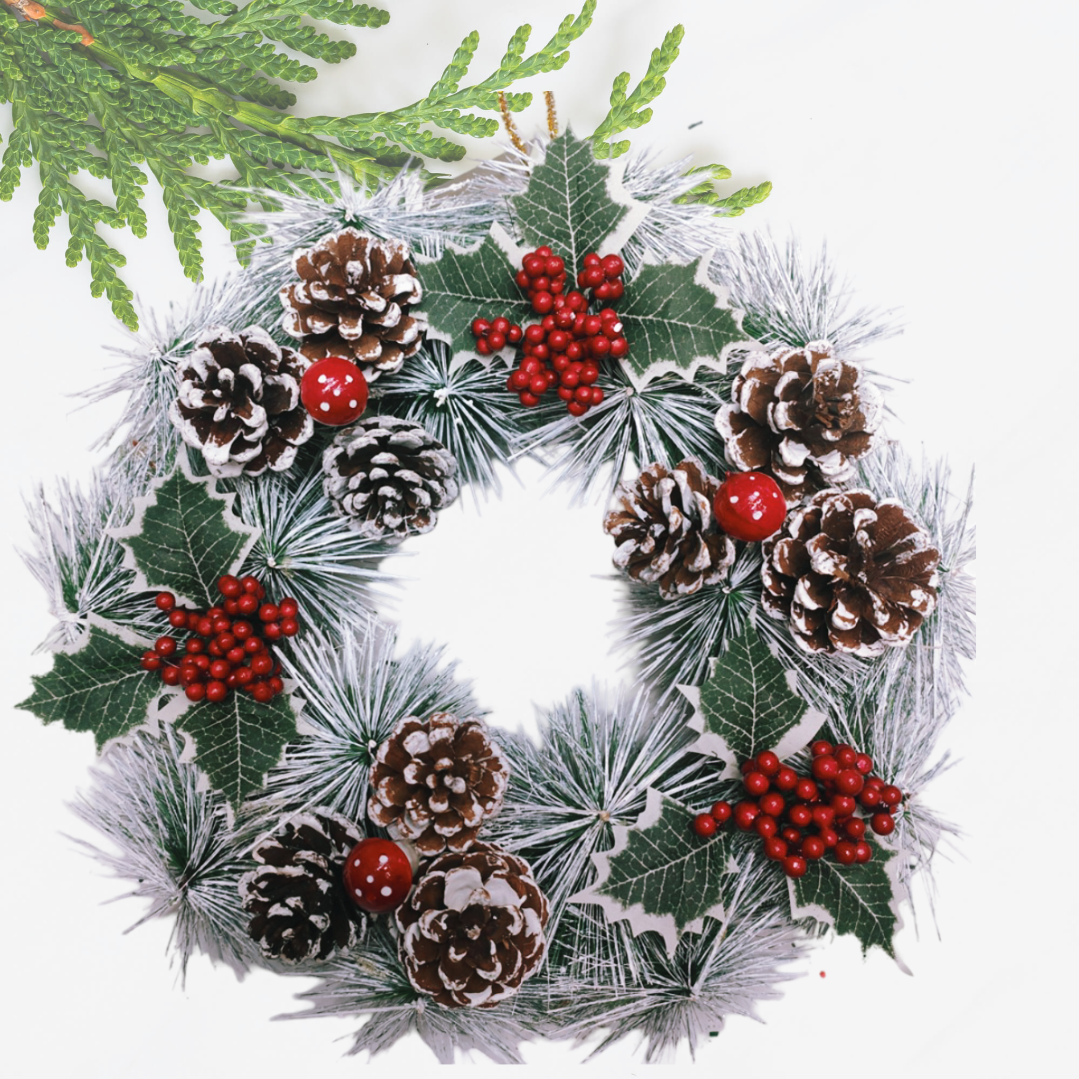 Coronita decorativa pentru Craciun, zapada artificiala, ornata cu conuri de brad, frunze verzi si vasc, 30 cm
