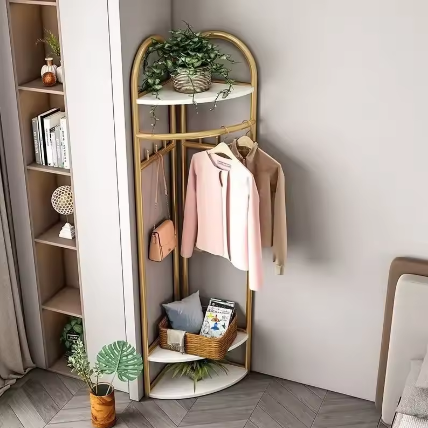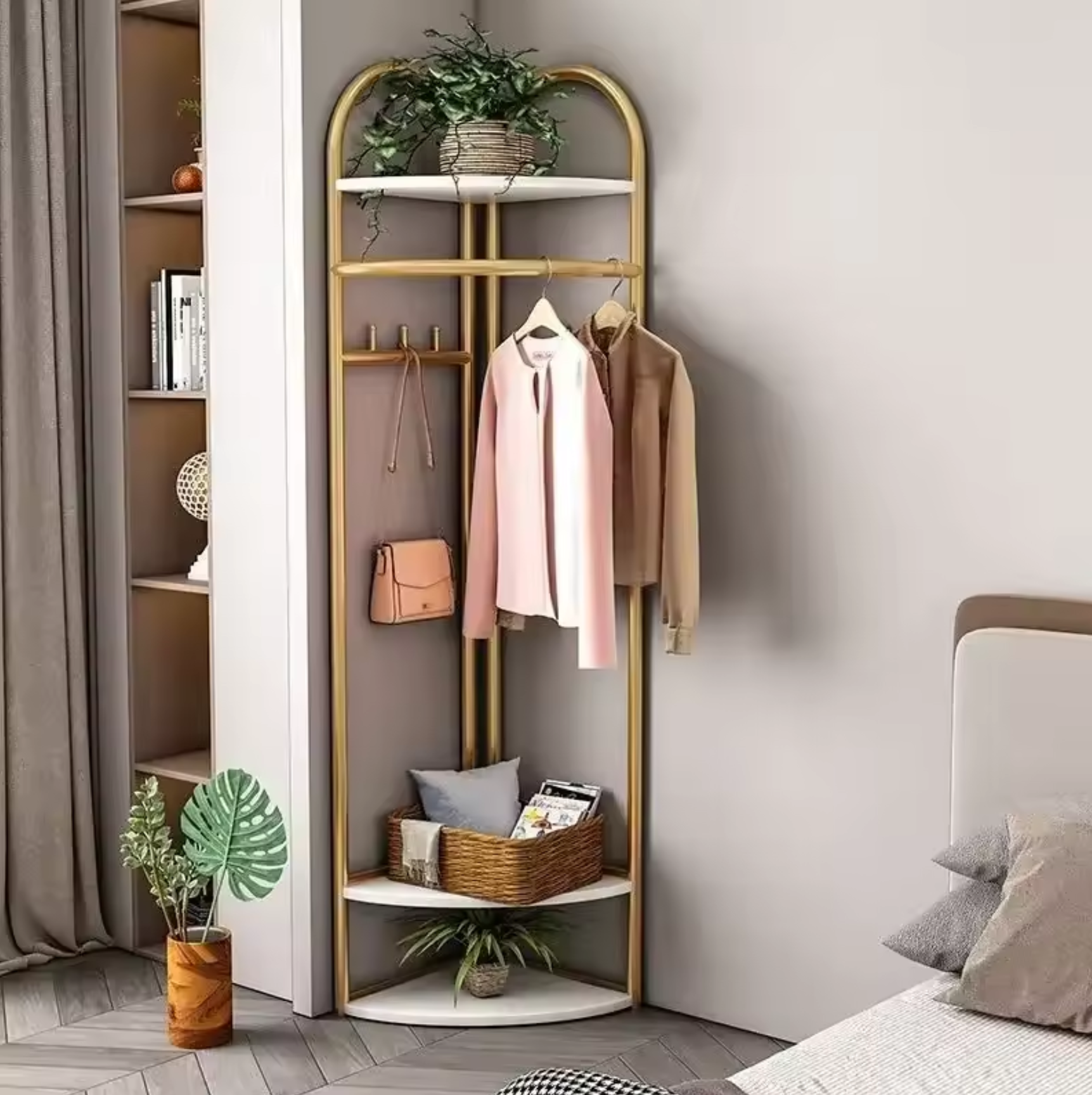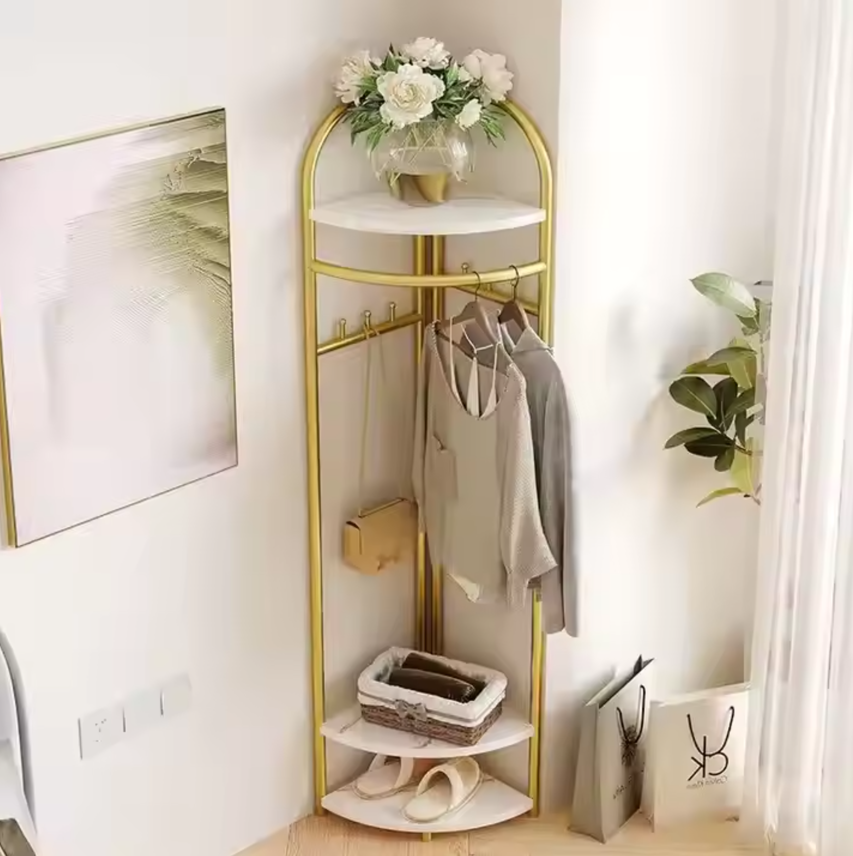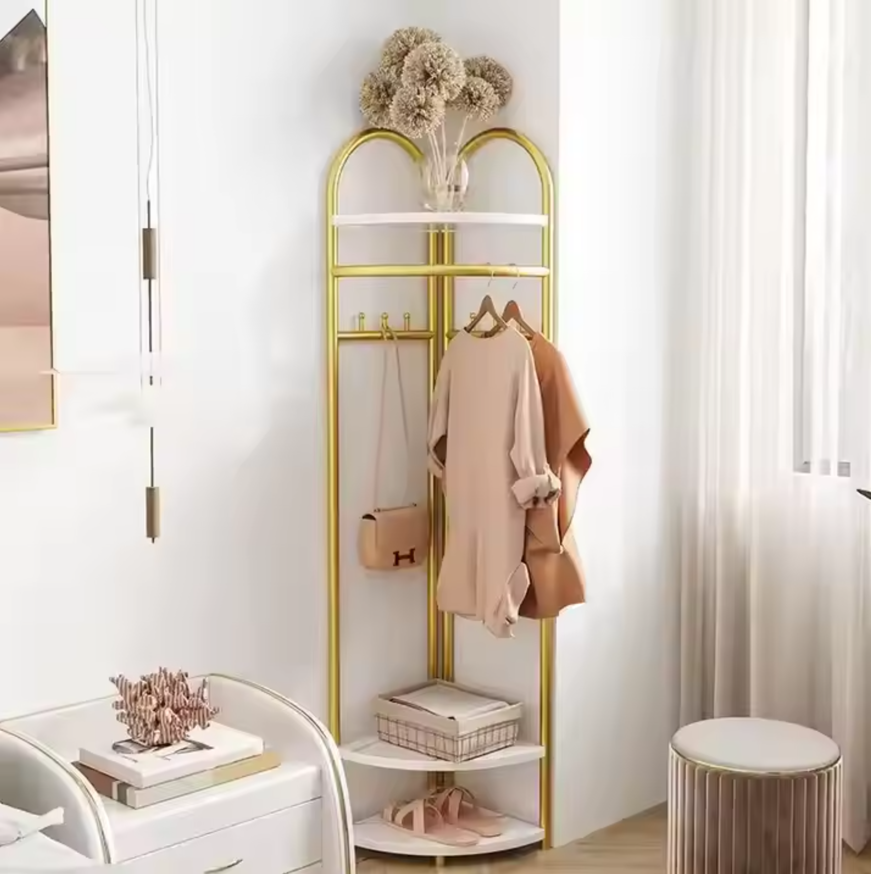 Transformă-ți spațiul într-o zonă organizată și elegantă cu acest cuier de colț multifuncțional care combină perfect stilul cu funcționalitatea!