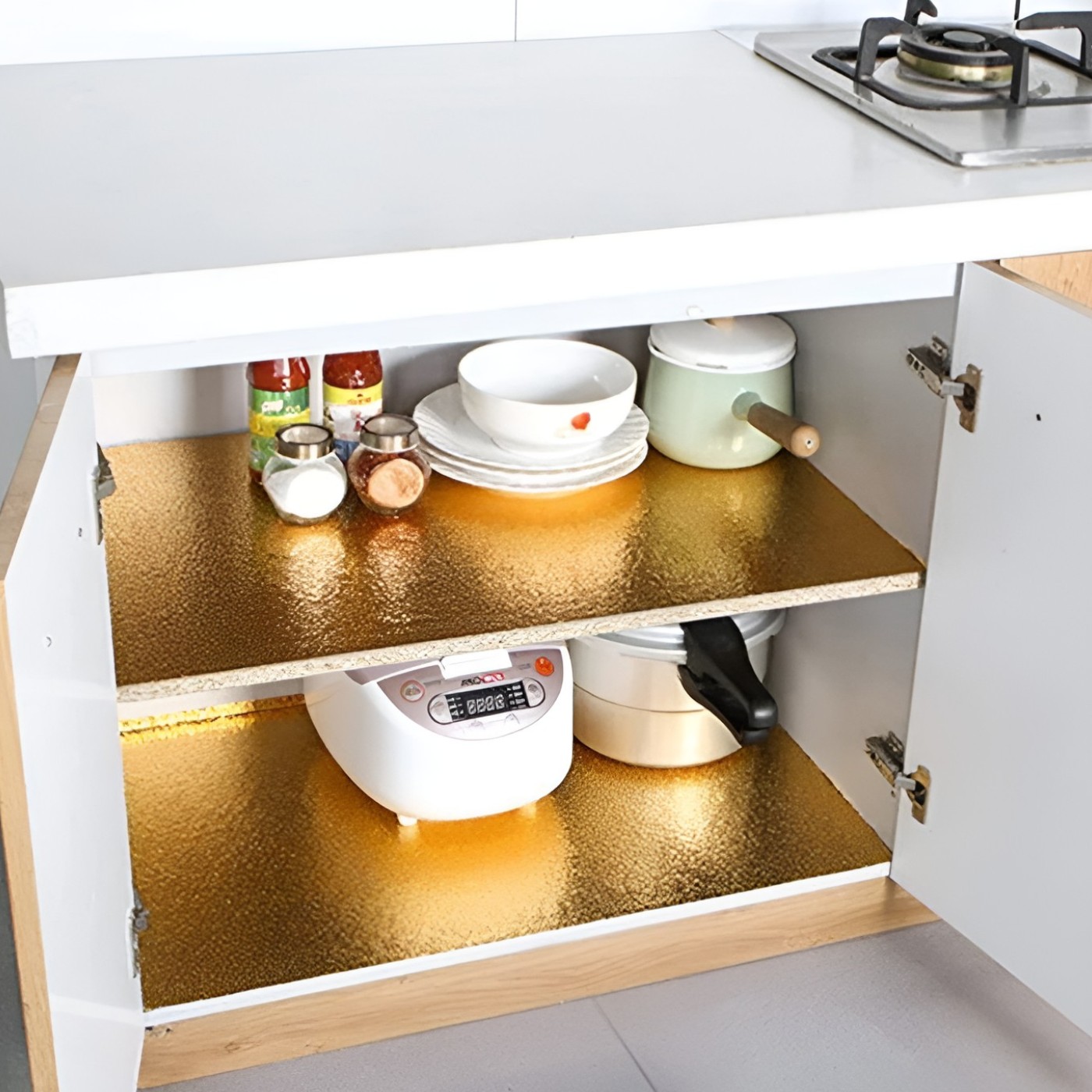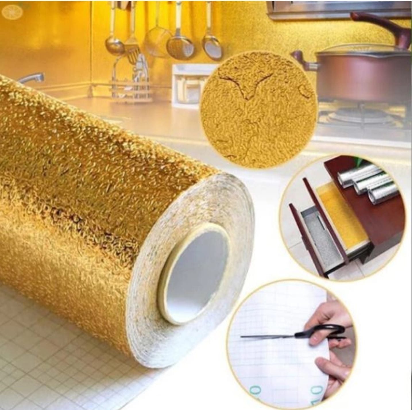 Transformă-ți bucătăria cu această folie autoadezivă aurie premium de 60x300cm – soluția perfectă pentru protecție și design elegant într-un singur produs!