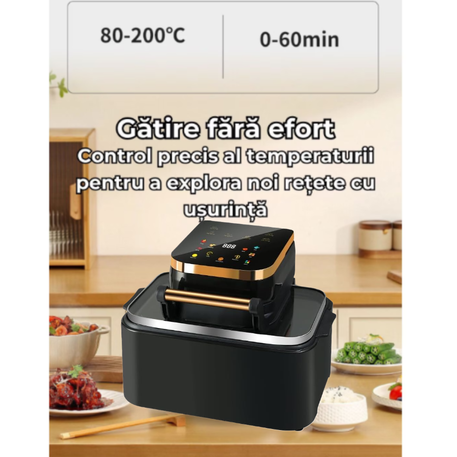 Transformă bucătăria ta într-un centru culinar profesional cu această friteuză de ultimă generație care combină tehnologia avansată cu designul elegant negru-auriu. Perfect pentru familiile moderne care apreciază alimentația sănătoasă și timpul economisit.