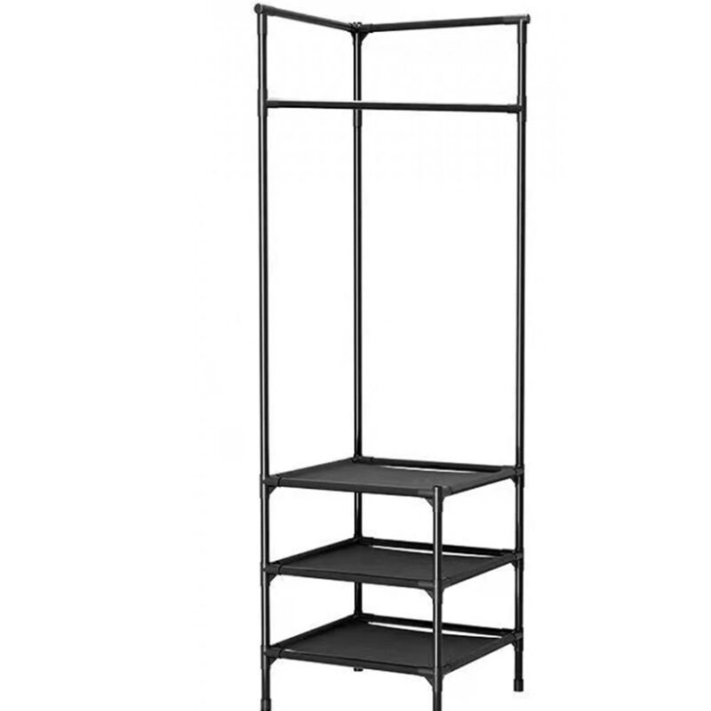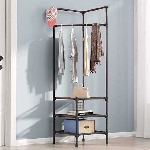 Transformă orice colț în spațiu de depozitare elegant! Raftul de colț pentru haine în culoarea neagră este soluția perfectă pentru a organiza eficient garderoba ta, optimizând fiecare centimetru din încăpere.
