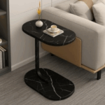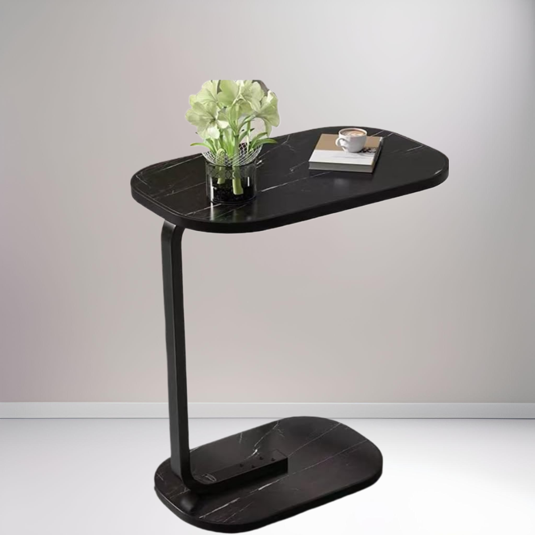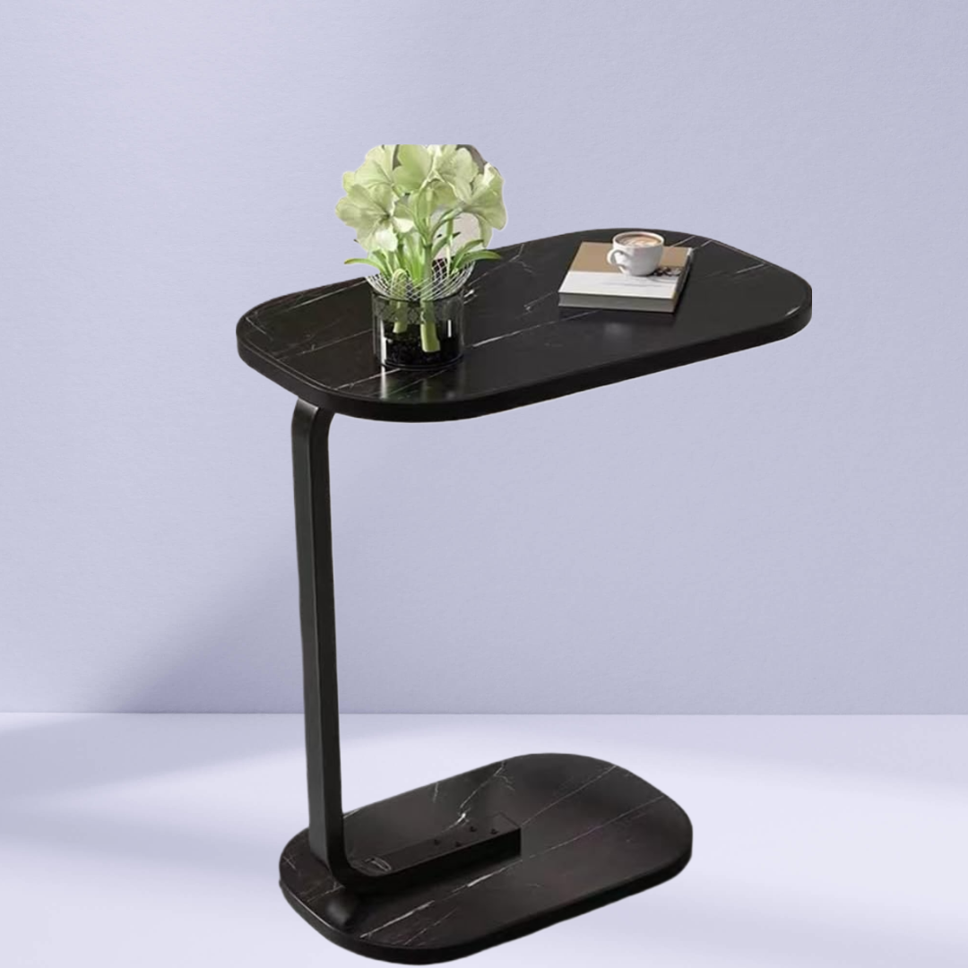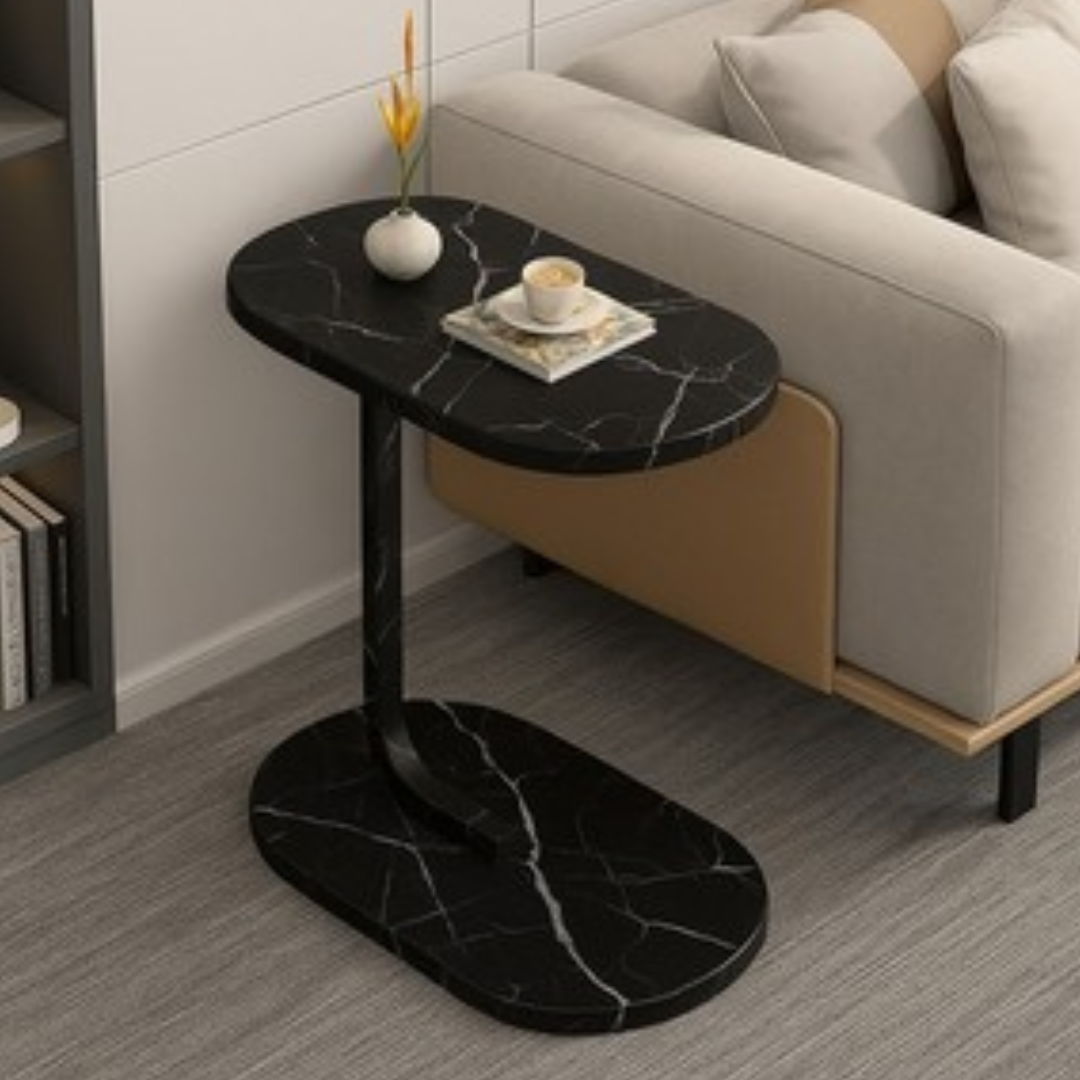 Transformă-ți livingul cu această măsuță laterală ovală cu finisaj sofisticat de marmură neagră!